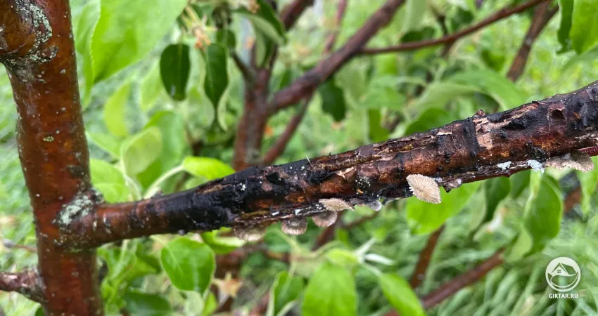 На яблоне одна ветка покрылась черными пятнами и потрескалась. Нужно ли ее обрезать, или можно вылечить?