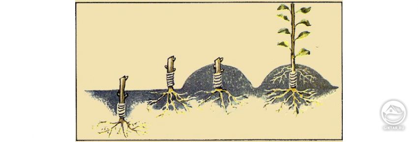 В срезы корней (за кору) нужно вставить черенки. Несколько черенков (обычно 2-3) на корни одного дерева прививаются для подстраховки (вдруг один не приживется). Канавку засыпают вынутой землей до верхушек привитых черенков, поливают.