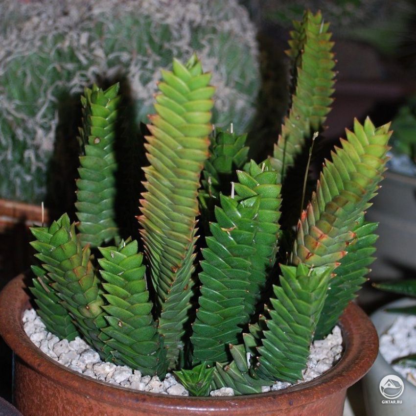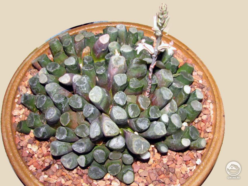 Хавортия пигмейская ( Haworthia pygmaea ) — обязана названием миниатюрным размерам: максимальная длина шершавой на ощупь листовой пластины достигает 1 см, а диаметр розетки — 6 см. Листья зеленые, мясистые, покрыты пупырышками по верхней стороне, которая также покрыта светло-зелеными прожилками.