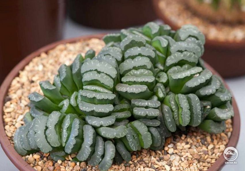 Хавортия извилистая ( Haworthia tortuosa ) — травянистое растение, имеет мелкую выпуклую снизу листву тёмно-зелёного оттенка, покрытую пупырышками.