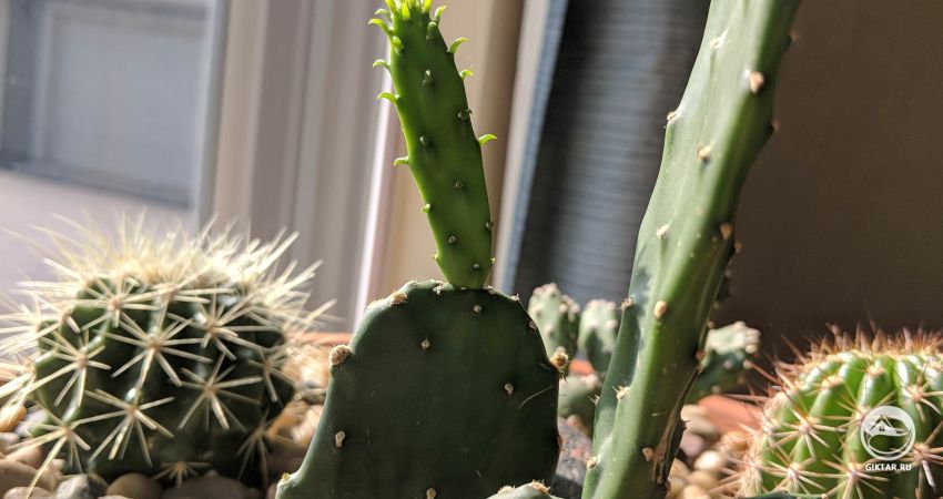 Новый росток появился на моей опунции "Emerald Wave" около недели назад и и быстро увеличивается в размерах, но кажется, что он слишком высокий и тонкий. Может быть это вытягивание из-за недостатка света ? Или это нормально. Растение стоит на восточном окне, на солнце около 5-6 часов в день.